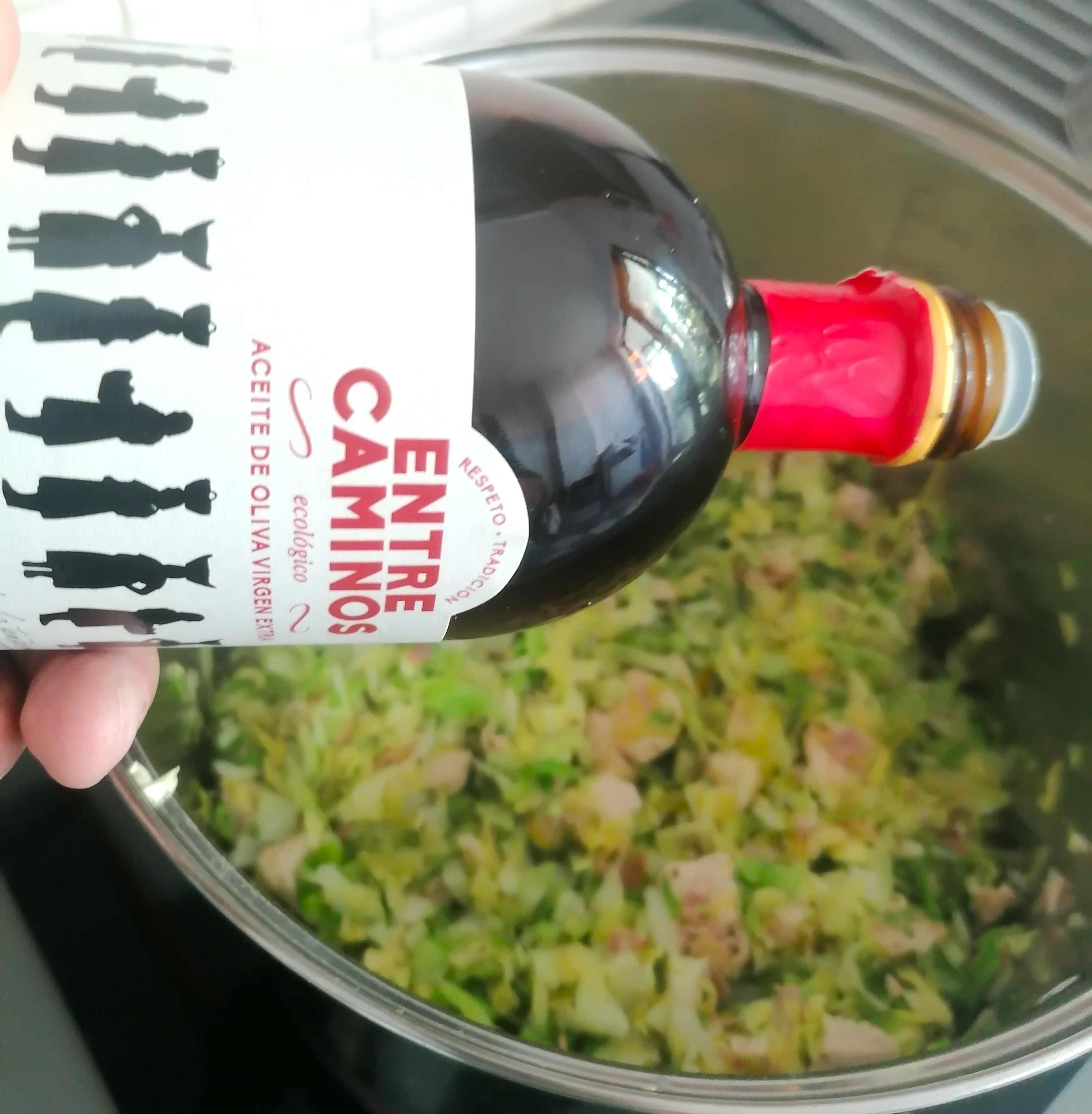 Na patelni rozgrzewamy dwie łyżki oliwy z oliwek extra vergine. Dodajemy czosnek i cebulę, smażymy przez 5 minut. Dodajemy zmielone przyprawy i mieszamy z cebulą, prażymy, ale nie przypalamy przez 30 sekund.