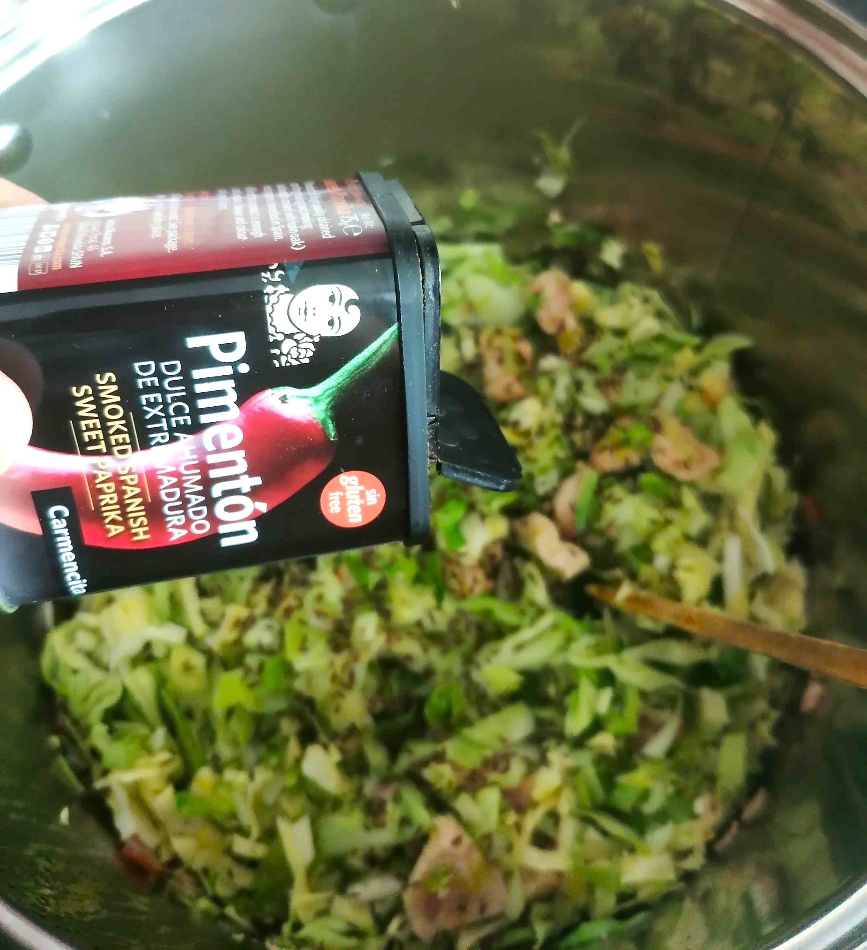 Dodajemy młodą kapustę, pół łyżeczki soli i pieprzu, szybko mieszamy. Skrapiamy bulionem warzywnym i przykrywamy pokrywką, aby zmiękły przez około 10–12 minut.