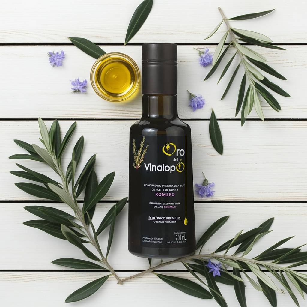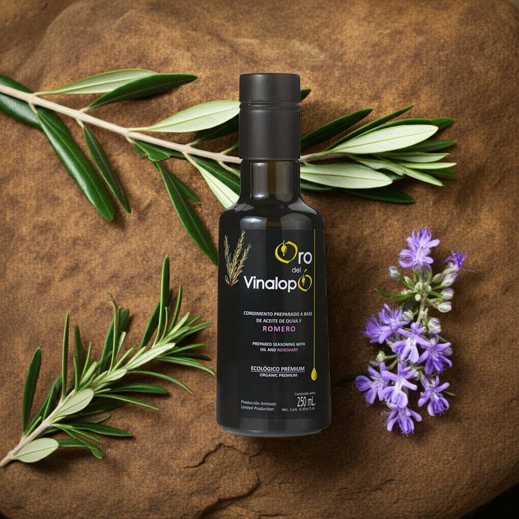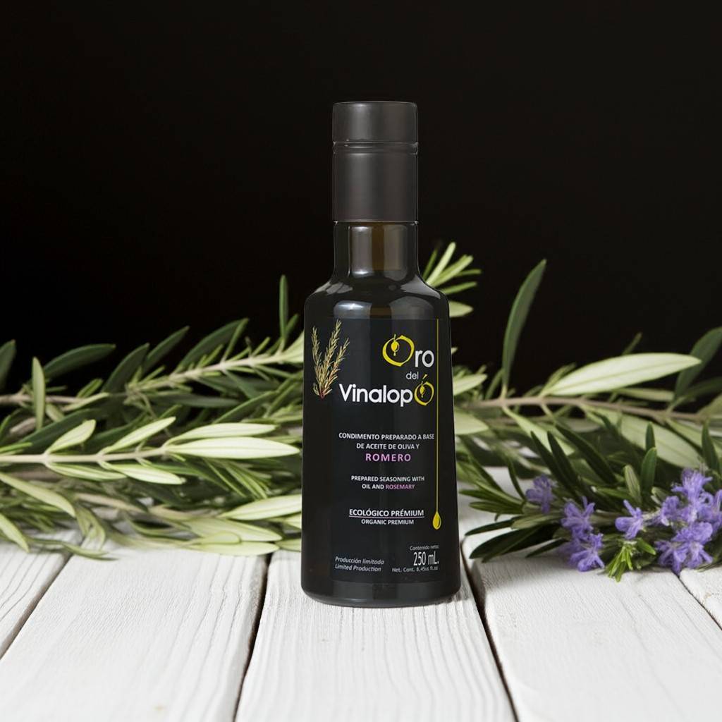 Oliwa z oliwek extra virgin najwyższej jakości otrzymana bezpośrednio z soku wyciskanych oliwek z dodatkiem świeżego organicznego rozmarynu. Jest to doskonała organiczna oliwa z oliwek bowiem oliwki użyte do tłoczenia pochodzą wyłącznie z upraw ekologicznych. Ekologiczna oliwa z rozmarynem ORO DEL VINALOPÓ to oliwa tłoczona na zimno za pomocą środków mechanicznych, bez użycia jakichkolwiek środków chemicznych. Oliwa do spożycia na surowo lub też jako idealny dodatek do smażonych ziemniaków.
