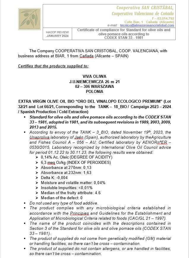 Posiadamy wymagane certyfikaty produkcji ekologicznej i pełną analizę chemiczną, potwierdzającą, że oliwa spełnia wszelkie wymogi UE, dotyczące najwyższej kategorii oliwy z pierwszego tłoczenia na zimno!