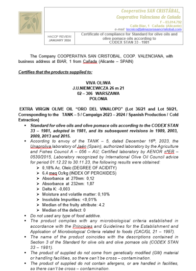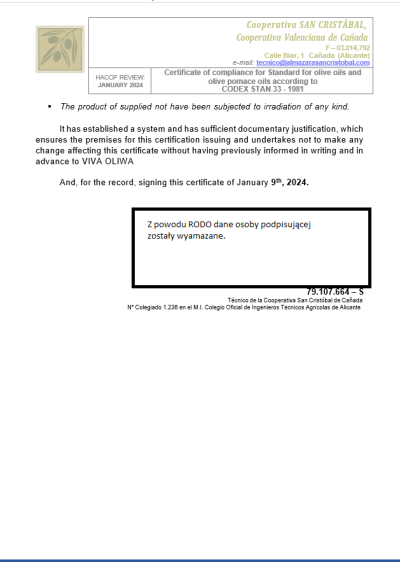 Posiadamy wymagane certyfikaty produkcji ekologicznej i pełną analizę chemiczną. Nasza oliwa spełnia wszelkie wymogi UE, dotyczące najwyższej kategorii oliwy z pierwszego tłoczenia na zimno!