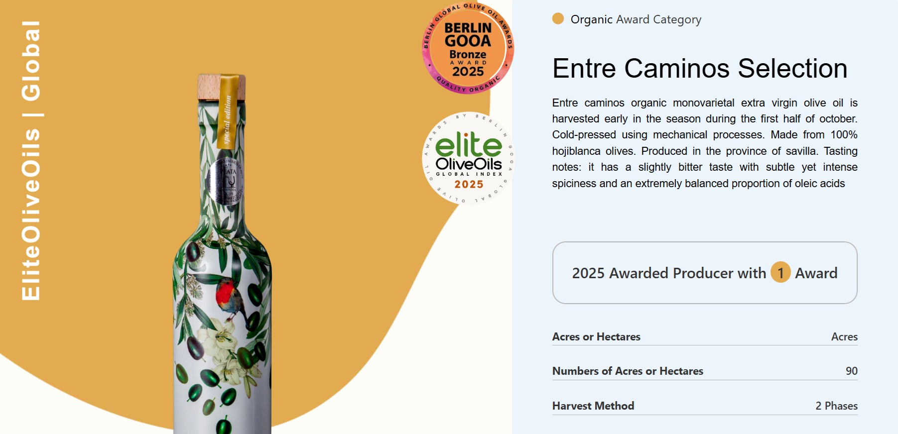 Wśród nagrodzonych znalazła się oliwa Entre Caminos Selección, produkowana w Andaluzji, w regionie Sewilli, ze 100% odmiany Hojiblanca. Produkt ten zdobył srebrny medal, co potwierdza jego wysoką jakość oraz doskonałe właściwości sensoryczne. To doskonały przykład, czym powinna być oliwa z oliwek prawdziwa – świeża, autentyczna i pełna naturalnego aromatu.